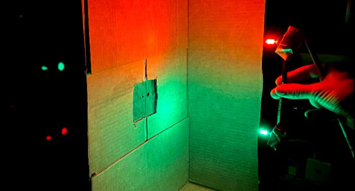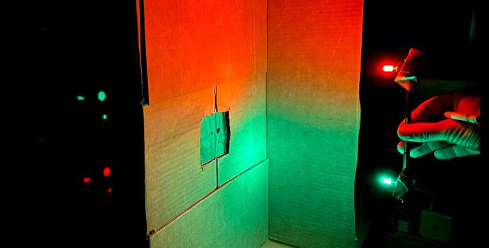 Được rồi, giờ nghĩ về điều này: Nhưng nếu có một lỗ thứ hai, lớn hơn, ngay cạnh lỗ đầu tiên—cạnh nhau. Mẫu hình gì bạn sẽ thấy trên màn hình với đèn cam và xanh lá cây? Hãy vẽ câu trả lời của bạn ở đâu đó, tôi sẽ đợi. Trong khi đó, đây là một bức ảnh về cài đặt: