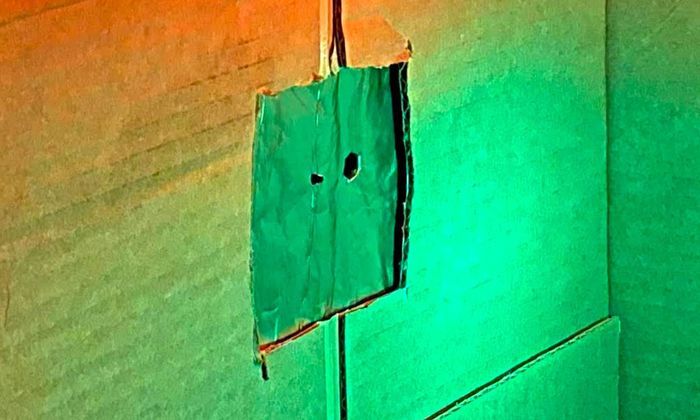 Nhưng đợi đã! Có một cách tốt hơn để làm điều đó. Thay vì cắt một lỗ thứ hai, bạn chỉ cần đặt điện thoại vào trong hộp, sao cho nó chỉ vào màn hình. Trên thực tế, tại sao lại dừng lại ở hình ảnh tĩnh? Bạn có thể sử dụng cài đặt này để tạo ra một máy ảnh video lỗ chính. Dưới đây là ghi lại nhìn như thế nào—đó là tôi (ngược lại) vẫy tay: