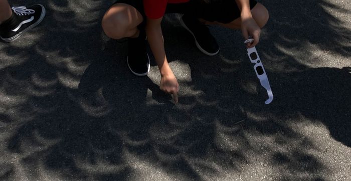 Những dải ánh sáng đó chủ yếu là sự chiếu hình của mặt trời trong khi có hiện tượng nhật thực mặt trời năm 2017, vào một thời điểm khi mặt trời chủ yếu bị che khuất bởi mặt trăng. Các lỗ được tạo ra bởi những khe nhỏ trong lá cây trên đầu. Mặc dù mặt trời trông rất nhỏ từ Trái Đất, với kích thước góc khoảng một nửa độ (lưu ý: đừng bao giờ nhìn vào mặt trời, ngốc à), nhưng những hình ảnh rất lớn do khoảng cách từ "lỗ chính" đến mặt đất. Thật tuyệt vời.