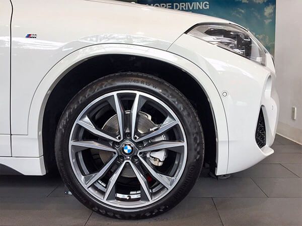 Xe được trang bị mâm hợp kim 5 chấu kép với hoa văn đơn giản hơn so với bản X2 sDrive20i, cùng lốp 225/55R17 97W. Tuy nhiên, BMW X2 bản cơ sở vẫn có tùy chọn gói trang bị M Performance, đặc trưng là bộ vành 19 inch 2 tông màu tương phản, kết hợp với lốp 225/45R19 của Continental.