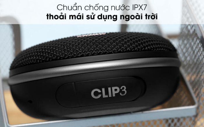 Nếu bạn quan tâm đến khả năng chống nước của các thiết bị điện tử, bạn không thể không biết về khả năng chống nước IPX7. Đây là một trong những tiêu chuẩn chống nước cao nhất được đánh giá. JBL clip 3 cũng được trang bị khả năng chống nước này. Theo nhà sản xuất, loa có thể hoạt động dưới nước độ sâu 1m trong 30 phút mà không bị hỏng.