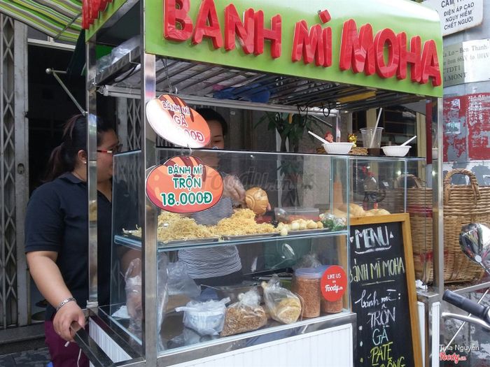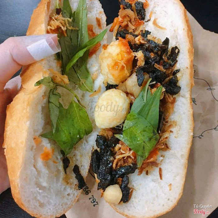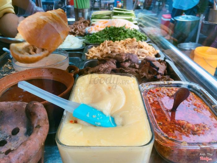 Xe bánh mì này đặt ở một con hẻm trên đường Đề Thám quận 1. Với các nguyên liệu quen thuộc như thịt bò đen, ruốc, mỡ hành, tóp mỡ, hành phi và cả rau răm, tương ớt,... đây thực sự là một phiên bản bánh mì hoàn hảo cho những buổi chiều đói bụng.