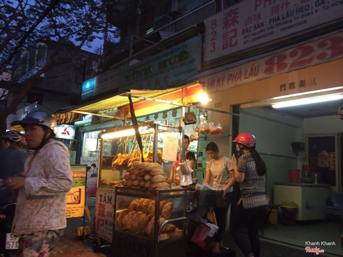 Phá lấu ở đây mang phong cách riêng của người Tiều. Một ổ bánh mỳ tại đây rất đầy đặn. Phần nhân phá lấu khá béo ngậy. Nếu muốn nhẹ nhàng, bạn nên nhắc nhở người bán khi nêm gia vị. Mỗi ổ bánh có giá 20k. Ngoài ra, bạn cũng có thể mua phá lấu theo kg để mang về nhà thưởng thức.