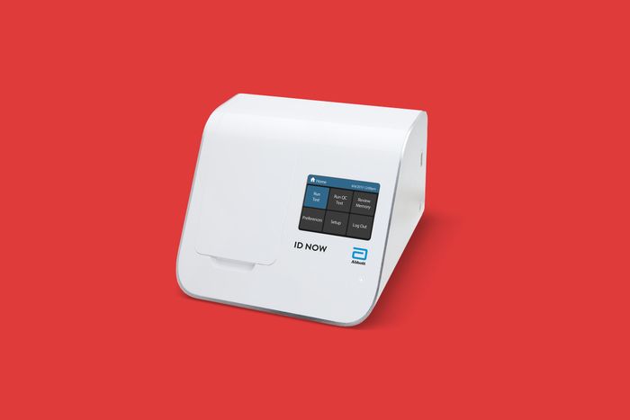 Vào ngày 27 tháng 3, tập đoàn y tế Abbott Laboratories nhận được sự chấp thuận từ FDA cho bài xét nghiệm Covid-19 thiết lập một tiêu chuẩn mới về tốc độ: Hiển thị kết quả dương trong năm phút và âm trong 13 phút. Bài xét nghiệm chạy trên nền tảng ID NOW, là dụng cụ phân tử chăm sóc điểm tại chỗ phổ biến nhất trong cả nước, theo Norman Moore, trưởng ban hợp tác khoa học tại Abbott. Đã có 18,000 thiết bị ID NOW trong phòng cấp cứu, phòng khám bác sĩ và phòng cấp cứu khẩn cấp trên khắp đất nước, giúp chẩn đoán các bệnh về hệ hô hấp một cách nhanh chóng. Nền tảng này là một thiết bị hình cánh cửa mà nhìn giống như một chiếc đồng hồ báo thức tương lai và nặng khoảng bảy pound, di động đủ để sử dụng xa hơn bệnh viện. “Thiết bị cho phép truy cập ngay lập tức đến nơi xét nghiệm bệnh nhân cần thiết nhất, đưa cuộc chiến vào hàng đầu trong nhiều cài đặt chăm sóc sức khỏe,” Moore nói, “như các cơ sở xét nghiệm drive-through hoặc sân bay. Tốc độ và tính di động của nó có thể giúp các nhân viên tuyến đầu chiến đấu trực tiếp với đại dịch này.”