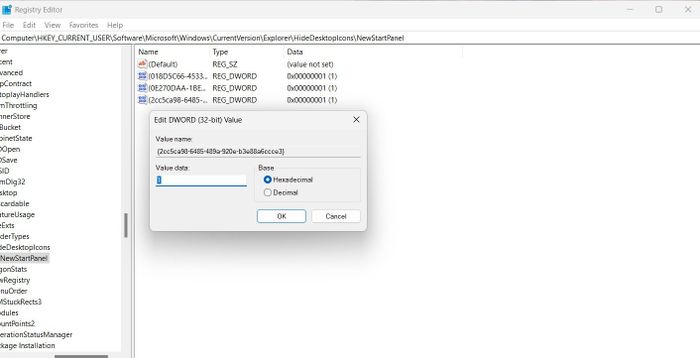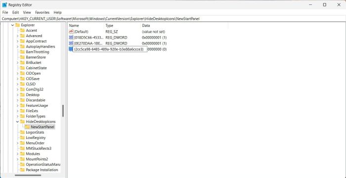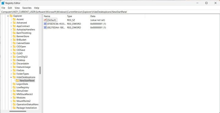 Biểu tượng máy ảnh này cũng xuất hiện trên màn hình khóa nếu bạn chọn Lock screen là Windows Spotlight và tương tự trên màn hình Desktop. Khi nhấp vào, nó sẽ mở ra trang Bing và hiển thị thông tin về bức ảnh, chẳng hạn như địa danh, loài vật, cây cỏ, sự kiện ... Ngoài ra khi nhấp chuột phải vào biểu tượng này, bạn cũng có thể nhanh chóng thay đổi hình nền nếu không thích hình nền đang hiển thị. Biểu tượng này liên kết với Windows Spotlight và chỉ biến mất khi bạn không chọn Spotlight trong cài đặt hình nền. Để ẩn nó đi, bạn cần phải sử dụng Regedit.Mở Run (bấm Windows + R) > gõ regedit > Enter hoặc tìm Regedit trong Menu StartSao chép đường dẫn dưới đây và dán vào thanh địa chỉ như hình sau đó nhấn Enter để mở thư mục NewStartPanel