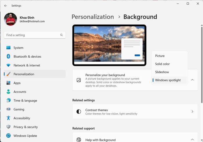 Trên Windows 11 22H2, Microsoft đã tích hợp Windows Spotlight vào cài đặt hình nền (Background) trong Phần Cài đặt > Cá nhân hóa. Thường tôi chọn Windows Spotlight để hình nền tự động thay đổi hàng ngày, tạo ra những hình ảnh sống động và đẹp mắt. Tuy nhiên khi chọn Spotlight, trên màn hình Desktop bất ngờ xuất hiện thêm biểu tượng máy ảnh có tên Learn about this picture. Nếu bạn cũng muốn sử dụng Spotlight nhưng không thích biểu tượng này xuất hiện, đây là cách để làm cho nó biến mất.