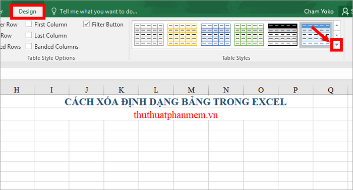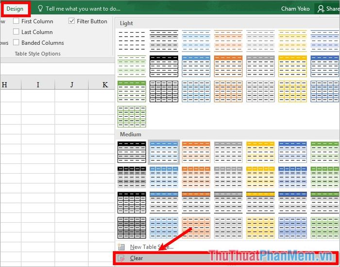 Cách 1: Sử dụng tính năng Clear trong Table Style của Tab Thiết Kế