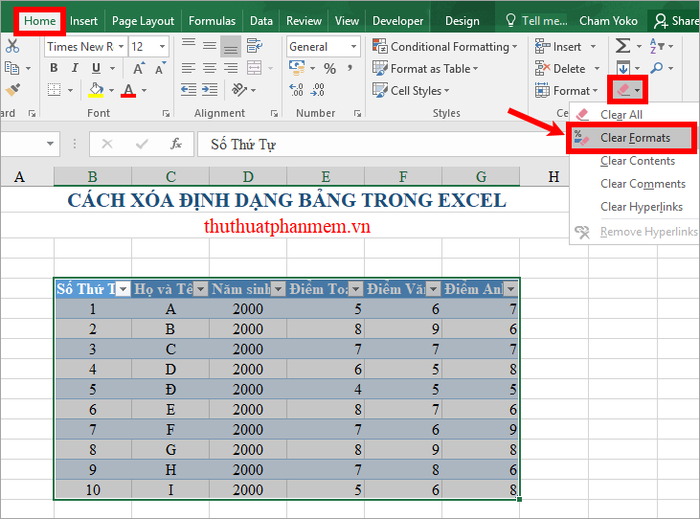 Chọn toàn bộ bảng cần xóa kiểu bảng, sau đó vào tab Home -> Clear -> Clear Format.