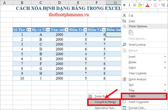 Bước 1: Chọn ô hoặc toàn bộ bảng, sau đó chuột phải và chọn Table -> Convert to Range.