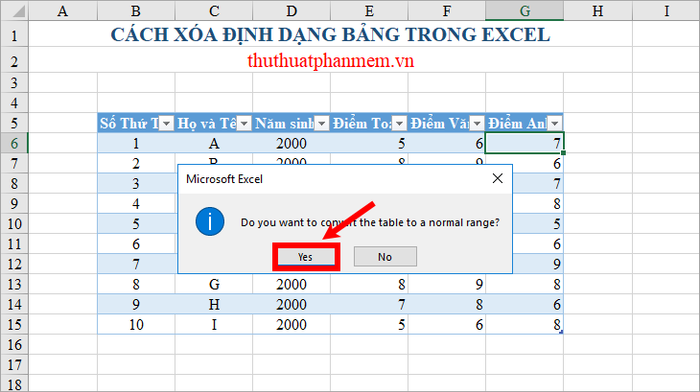 Bước 2: Khi xuất hiện thông báo Do you want to convert the table to a normal range? (bạn có muốn chuyển đổi bảng thành phạm vi bình thường không?), nhấn Yes để xác nhận.