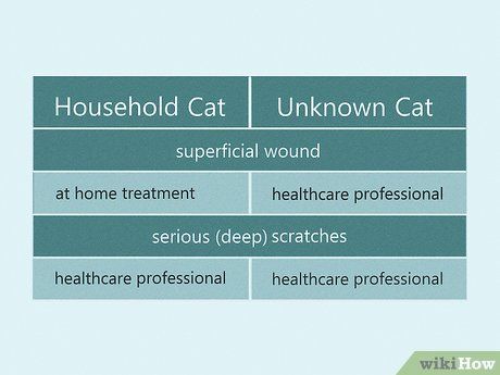 Nhận diện mèo. Điều quan trọng là phải biết thông tin về con mèo đã gây ra vết thương. Nếu đó là mèo nuôi hoặc mèo nhà của bạn, bạn có thể tự xử lý vết thương nếu không quá nặng, nhưng cần biết chính xác về mèo, bao gồm thông tin về tiêm phòng vắc-xin, sức khỏe, và môi trường sống.
