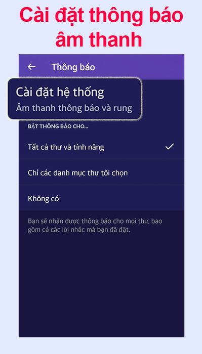 Cài đặt thông báo hộp thư với những âm thanh sinh động trong phần Cài đặt của ứng dụng. Thông báo sẽ giúp bạn không bỏ lỡ những tin tức quan trọng từ bạn bè, đồng nghiệp, và người thân.