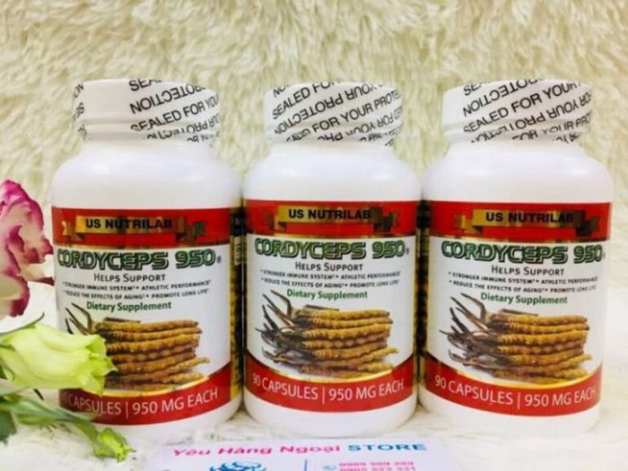 - Đông trùng hạ thảo cao cấp của Mỹ – CORDYCEPS 950mg – 100% thành phần tự nhiên: Với 17 axit amin đặc biệt, D-manitol, Lipit và nhiều vi khoáng như Canxi (Ca), Sắt (Fe), Kẽm (Zn), Magie (Mn), Đồng (Cu) cùng Selen quan trọng cho hệ miễn dịch, kèm theo vitamin B12, C, B2, E, đông trùng hạ thảo CORDYCEPS 950mg giúp người sử dụng đối phó với các vấn đề về sức khỏe do tuổi già như bệnh gan, thận, cholesterol cao, huyết áp cao cũng như sự suy giảm sinh lý và mệt mỏi. Nó cũng hỗ trợ bổ thận, bổ phổi, điều trị hen suyễn, tăng cường sinh lý, phục hồi chức năng thận và giúp quý ông tự tin hơn; hỗ trợ điều trị ung thư, giảm nguy cơ di căn của khối u, tăng sản xuất hồng cầu, cải thiện chức năng gan, giảm đường huyết ở bệnh nhân tiểu đường, giảm tiểu đêm ở người già, giúp ngủ ngon và sâu hơn, cung cấp năng lượng và tăng cường sức khỏe tổng thể.