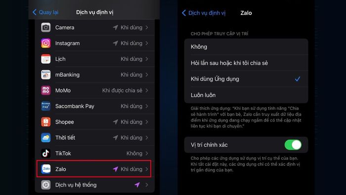 Choose the location service sectionStep 3: Locate the Zalo app and allow it to access your location. Simply choose the 'When Using the App' option as shown in the illustration.