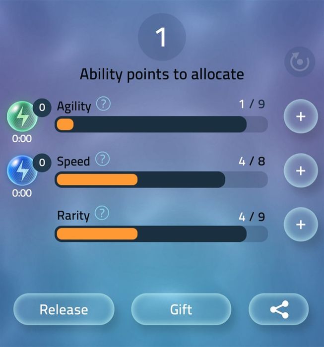 Sau mỗi cấp độ, bạn sẽ được thưởng 1 điểm kỹ năng để cải thiện Agility (nhanh nhẹn), Speed (tốc độ), hoặc Rarity (độ quý hiếm).
