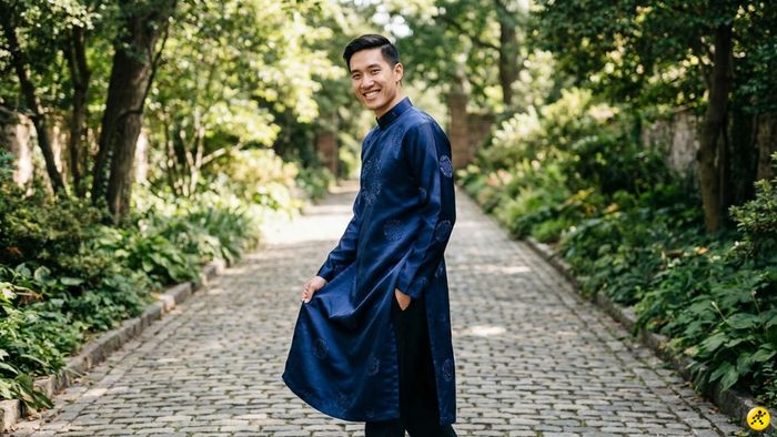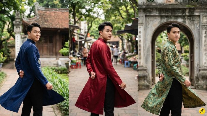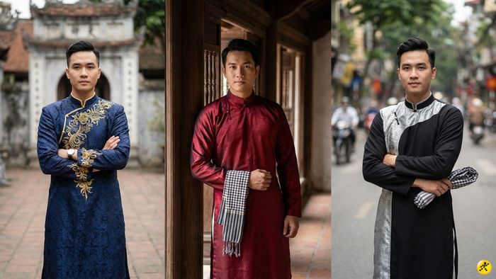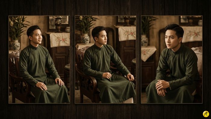 Nghiêng nhẹ người sang một bên với góc 45 độ, tay phải chạm nhẹ vào tà áo phía sau, tay trái đặt lên eo hoặc khoanh tay trước ngực. Đầu hơi ngẩng lên nhìn xa, tạo chiều sâu cho bức ảnh, vừa mềm mại vừa giữ được vẻ nam tính.