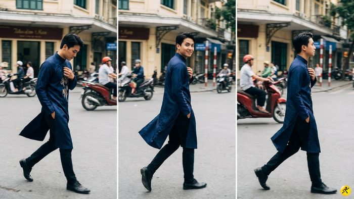 Giả vờ bước đi một cách tự nhiên để tà áo bay nhẹ, một tay đút vào túi quần, tay còn lại nhẹ nhàng ve áo. Nhìn xuống đất hoặc qua vai về phía camera, chụp liên tục để ghi lại khoảnh khắc sống động.