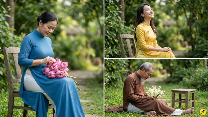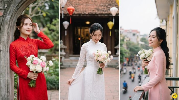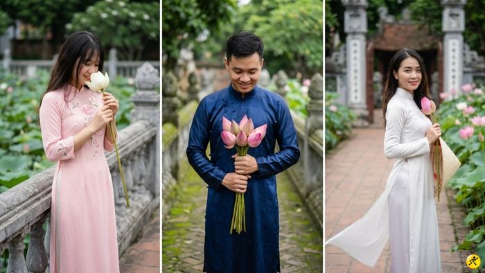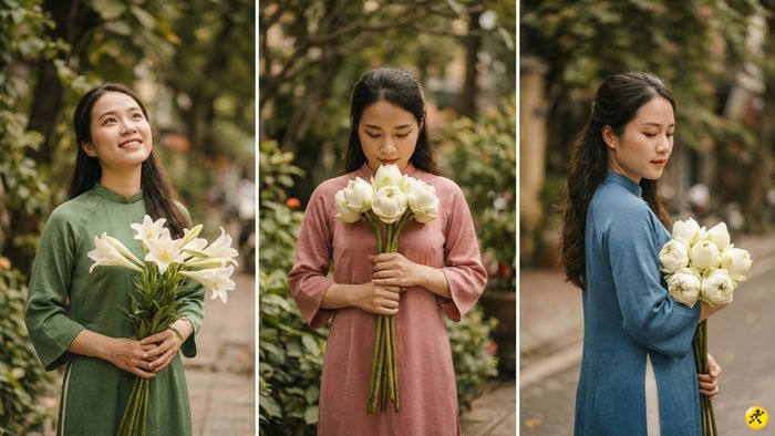Ôm bó hoa sen hoặc huệ trắng ngang ngực hoặc eo, vai thả lỏng, cằm hạ nhẹ nhìn xuống hoa rồi từ từ ngẩng lên, mỉm cười e ấp nhìn vào camera. Xoay người khoảng 20-30 độ để tà áo tự nhiên rủ xuống, tạo cảm giác kín đáo nhưng vẫn thanh lịch.