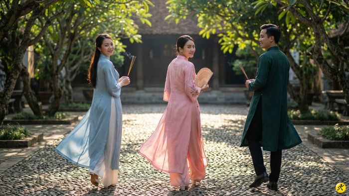 Bước chậm rãi trên lối đá sỏi, tay cầm hương hoặc quạt giấy, quay đầu nhìn qua vai về điện thờ. Chụp bằng chế độ burst để bắt được tà áo bay và ánh nắng xuyên qua lá, giữ không khí nhẹ nhàng và thanh tịnh, tránh sự ồn ào.
