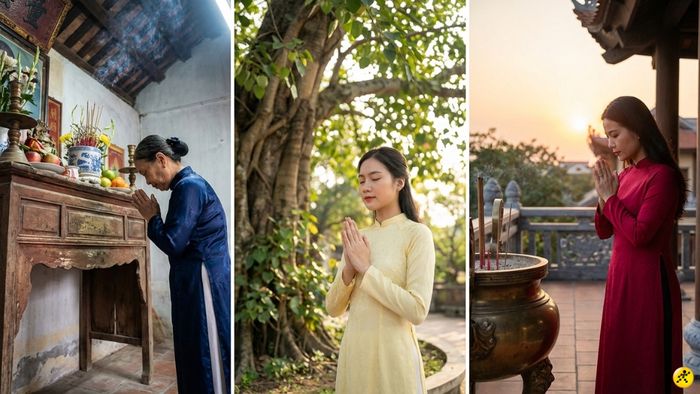Đứng trước bàn thờ hoặc cây bồ đề, hai tay chắp trước ngực, nhắm mắt để tĩnh tâm, đầu hơi cúi xuống. Tà áo dài thả tự nhiên, chụp từ góc ngang hoặc thấp để bắt được làn khói hương bay, tạo cảm giác thành kính và sâu lắng.