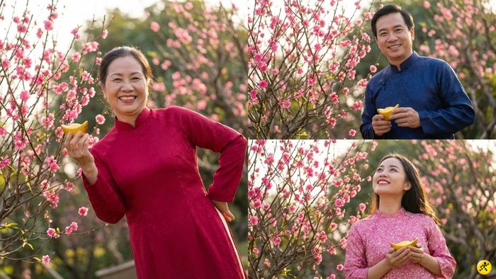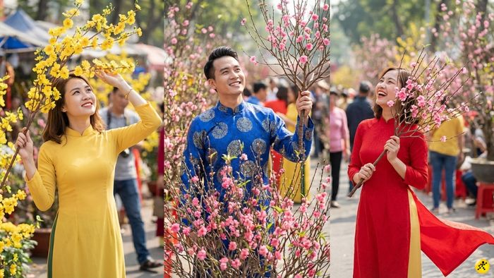 Nâng nhẹ cành mai vàng hoặc đào hồng ngang vai, nghiêng đầu về phía hoa, đứng giữa khung cành hoa làm nền. Ánh mắt ngước lên vui tươi, tà áo bay nhẹ trong gió, tạo nên bức ảnh rực rỡ đầy không khí Tết.