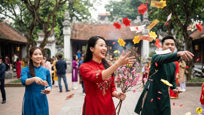 Tay phải xòe nhẹ tung cánh hoa tiền (giấy đỏ vàng), tay trái ôm bó mai ngang ngực, quay mặt nghiêng nhìn hoa rơi. Chụp bằng chế độ burst để bắt khoảnh khắc hoa bay bổng, tạo cảm giác tài lộc dồi dào, ngập tràn.
