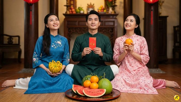 Ngồi đài các bên mâm trái cây Tết (dưa hấu, cam, bưởi), tay cầm quả vàng hoặc bao lì xì đặt trên đùi, đầu hơi ngẩng mỉm cười. Chân duỗi nhẹ, khép nép một bên, sử dụng hiệu ứng xóa phông để làm nổi bật các phụ kiện, biểu thị ngũ phúc lâm môn.