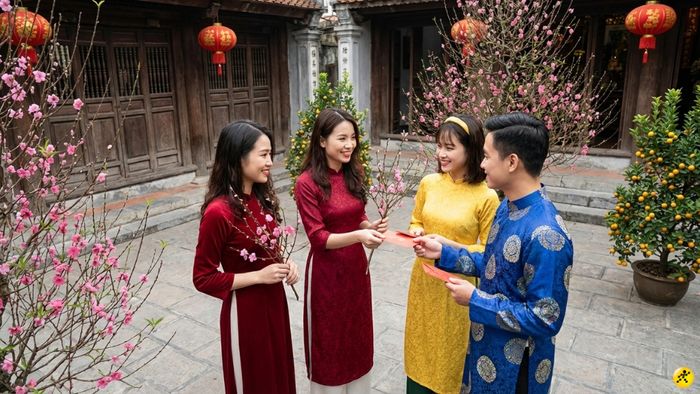Bạn thân đứng thành vòng tròn, người ở trung tâm cầm xấp lì xì trao cho nhau với nụ cười tươi, tay kia ôm hoa đào. Xếp đội hình cao thấp xen kẽ tạo chiều sâu, chụp góc rộng để làm nổi bật biểu tượng "lì xì trao tay, phúc lộc đầy nhà".