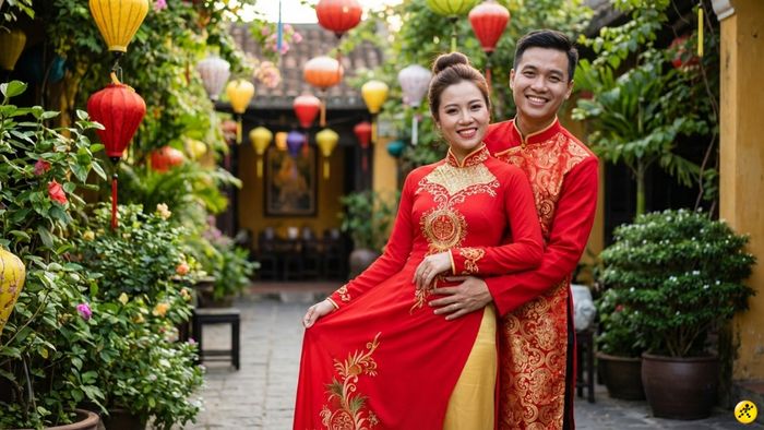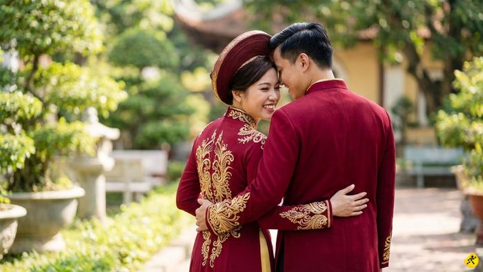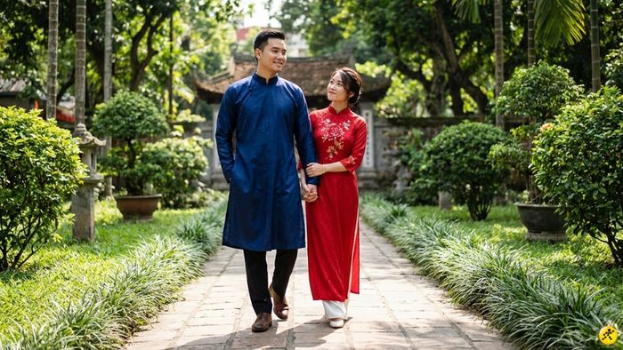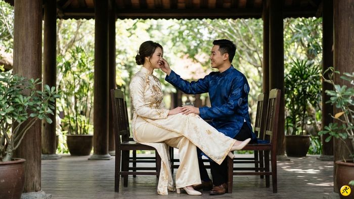 Cách tạo dáng chụp ảnh áo dài đám cưới cho cả nam và nữ nhấn mạnh sự lãng mạn, gắn kết, đồng thời tôn vinh vẻ thanh lịch truyền thống của cặp đôi. Các dáng này dễ phối hợp và ưu tiên các background cổ kính như đình làng, vườn hoa, với ánh sáng vàng ấm để bức ảnh trở nên lung linh hơn.