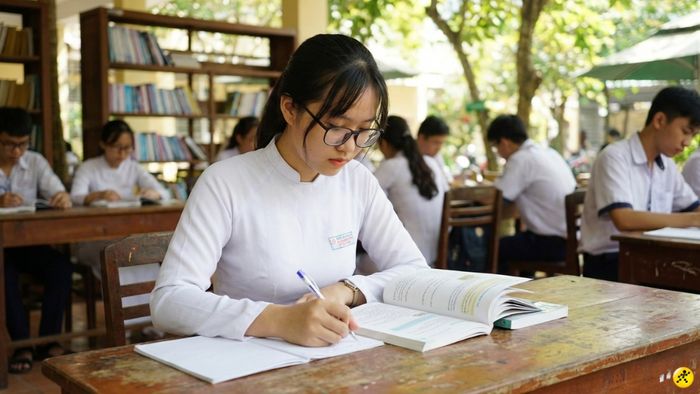 Ngồi trên bàn, chăm chú lắng nghe giảng bài hoặc đang tập trung làm bài, viết bài.