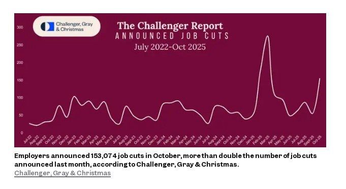 Theo CNN, tháng 10 đã kết thúc với một cảnh báo u ám cho nền kinh tế Mỹ: hơn 153.000 trường hợp cắt giảm việc làm được công bố, mức cao nhất của tháng 10 kể từ năm 2003 và gấp đôi so với tháng 9/2025.