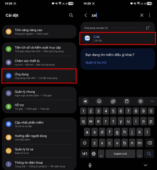 Bước 1: Truy cập vào mục Cài đặt trên thiết bị di động > Chọn phần Ứng dụng > Tìm và nhấn vào ứng dụng Zalo.