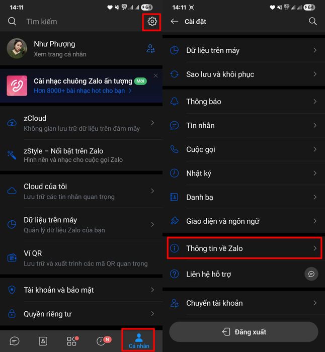 Bước 1: Mở ứng dụng Zalo trên điện thoại > Chọn tab Cá nhân > Nhấn vào biểu tượng Cài đặt > Cuộn xuống và chọn mục Thông tin ứng dụng.