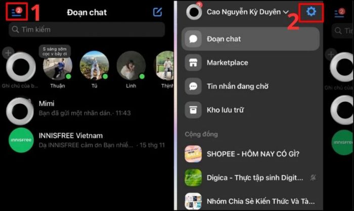 Bước 1: Mở ứng dụng Messenger. Sau đó, nhấn vào biểu tượng ba dấu gạch ở góc trái của màn hình và tiếp tục chọn biểu tượng Cài đặt.