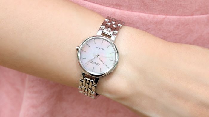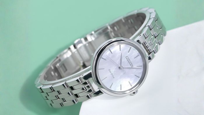 Mình đặc biệt gợi ý mẫu CITIZEN L 28 mm Nữ EM0990-81Y. Thuộc dòng Citizen L cao cấp thiết kế riêng cho phái đẹp, chiếc đồng hồ này như một món trang sức sang trọng tỏa sáng trên cổ tay nàng. Đường kính 28 mm nhỏ xinh kết hợp độ mỏng ấn tượng 7.7 mm mang đến vẻ đẹp thanh thoát, mềm mại nhưng vẫn đầy cuốn hút.