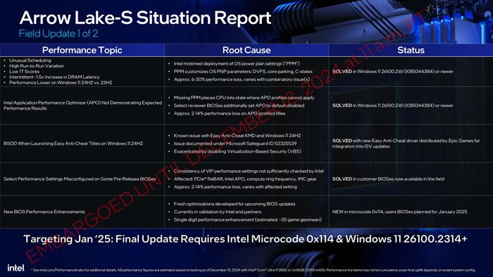 Ngoài việc hiệu năng không đạt kỳ vọng, ARL-S còn gặp phải một số lỗi khác mà Intel đã phát hiện và sửa chữa. Chẳng hạn như sự cố Intel APO không hoạt động đúng, hoặc xuất hiện BSOD khi chơi các game hỗ trợ Easy Anti-Cheat trên Windows 11 24H2. Bản cập nhật BIOS mới nhất này nhằm khôi phục lại hiệu năng mà người dùng kỳ vọng từ khi Core Ultra 200S chính thức ra mắt.