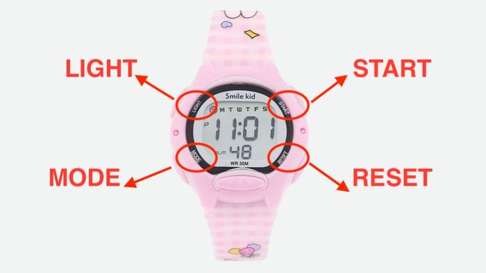 Đồng hồ điện tử dành cho trẻ em thường được trang bị 4 nút bấm với các chức năng sau: