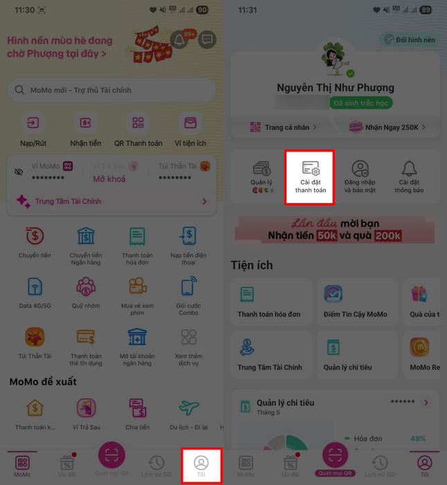 Bước 1: Mở ứng dụng MoMo trên điện thoại của bạn > Chọn mục Tôi để truy cập trang cá nhân và điều chỉnh cài đặt > Sau đó, chọn mục Cài đặt thanh toán để bắt đầu quản lý các dịch vụ thanh toán tự động.