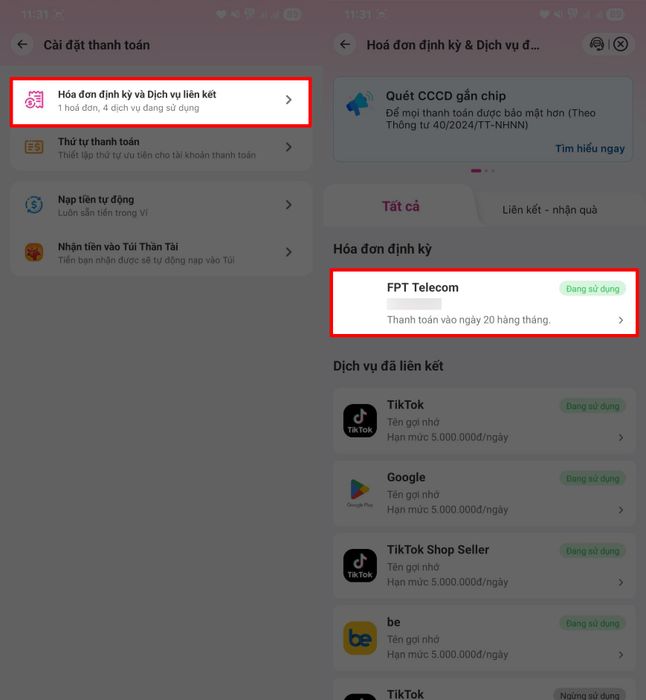Bước 2: Tiếp theo, chọn mục Hóa đơn định kỳ và dịch vụ liên kết > Bạn sẽ thấy danh sách các hóa đơn thanh toán định kỳ đã được liên kết trước đó. Hãy chọn các hóa đơn mà bạn muốn hủy thanh toán tự động.