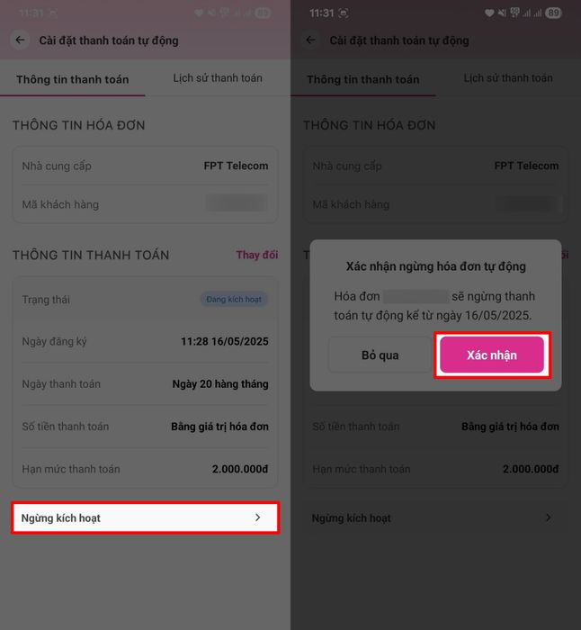 Bước 3: Ở cuối màn hình, bạn sẽ thấy mục Ngừng kích hoạt, nhấn vào đây để hủy liên kết với dịch vụ > Sau đó, bạn cần xác nhận việc hủy liên kết để hoàn tất thao tác.