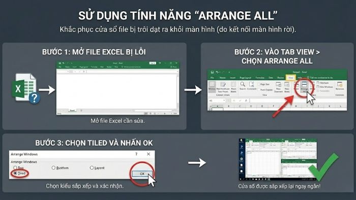 Hành động này sẽ khiến tất cả các cửa sổ Excel đang mở được sắp xếp lại ngay ngắn trên màn hình chính.