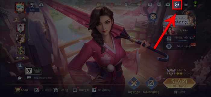 Bước 1: Mở ứng dụng Liên Quân Mobile trên điện thoại > Sau đó, nhấn vào biểu tượng cài đặt ở góc trên bên phải.