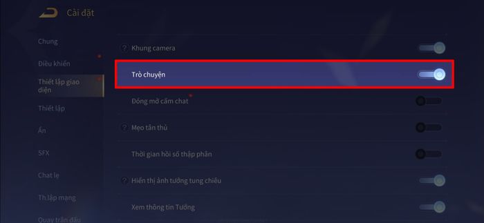 Bước 3: Kéo xuống dưới và tìm mục Trò chuyện > Sau đó, gạt công tắc để kích hoạt tính năng chat trong trận đấu.