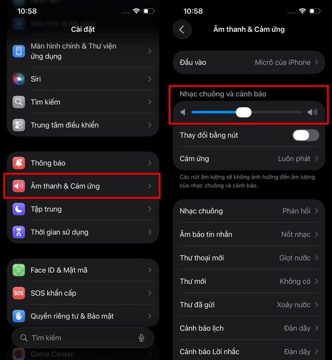 Truy cập vào Cài đặt > Chọn mục Âm thanh và Cảm ứng > Trong phần Nhạc chuông và Cảnh báo, bạn kéo thanh âm lượng lên mức cao nhất để âm thanh rõ ràng hơn.