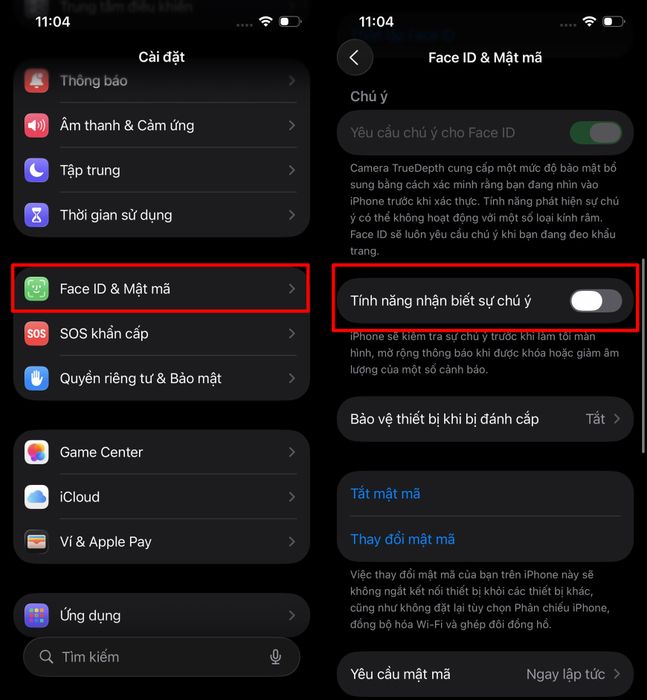 Bước 1: Truy cập vào Cài đặt trên iPhone > Chọn Face ID & Mật mã > Nhập mật mã của bạn > Cuộn xuống và tìm mục Tính năng Nhận biết sự chú ý > Gạt nút để tắt tính năng này.