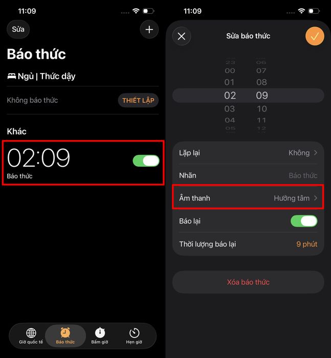 Bước 1: Nhấn vào báo thức mà bạn muốn Thay đổi nhạc chuông > Tiếp theo, chọn mục Âm thanh.