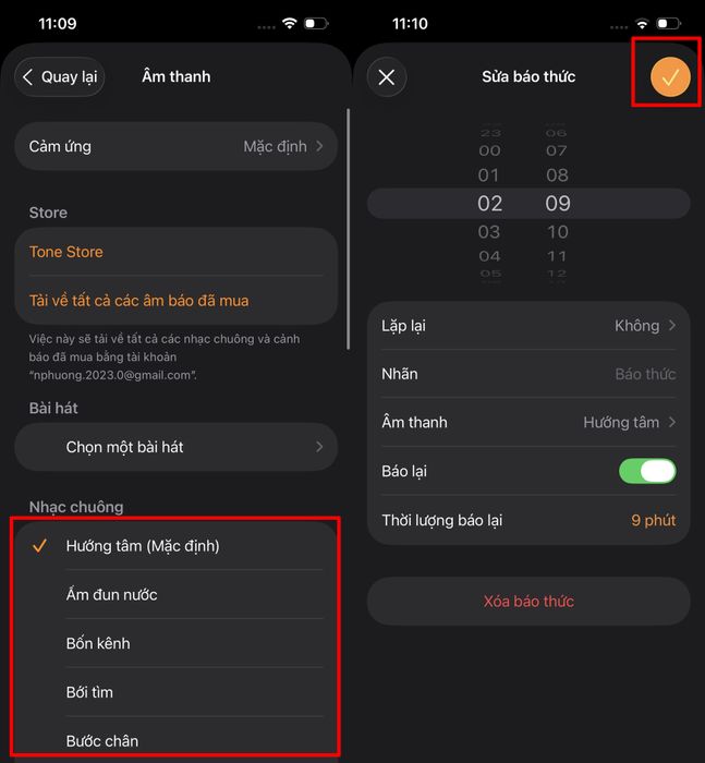 Bước 2: Lựa chọn một âm báo thức có âm lượng lớn nhất hoặc âm thanh phù hợp > Sau khi chọn xong, quay lại và nhấn dấu tick chữ V ở trên cùng để lưu lại nhạc chuông mới.