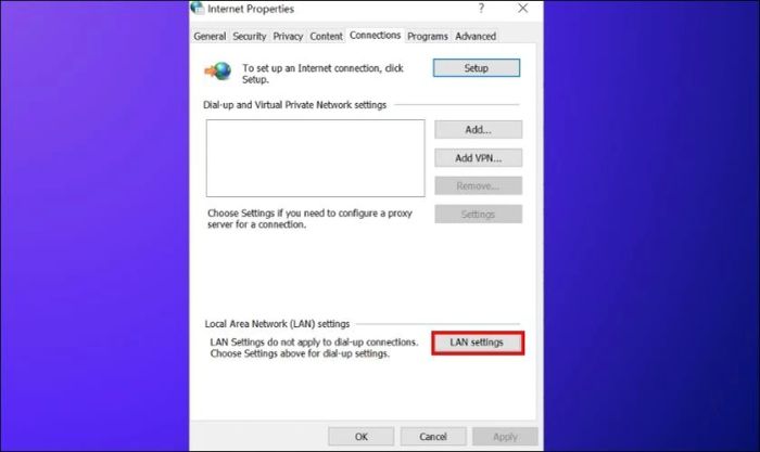 Bước 2: Trong tab Connections, bạn hãy nhấn vào nút LAN Settings.
