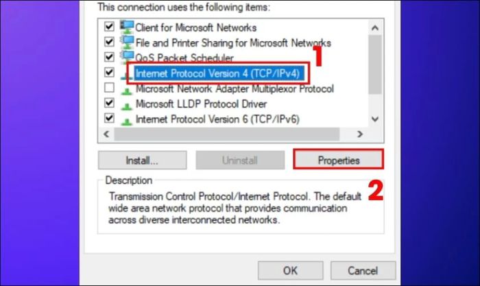 Bước 3: Trong cửa sổ Properties, chọn Internet Protocol Version 4, sau đó nhấn vào Properties.