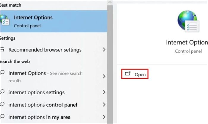 Bước 1: Trong thanh tìm kiếm của Windows, bạn gõ Internet Options và chọn Open.